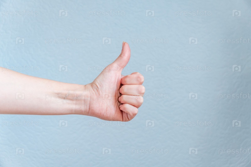 Женская рука показывает большой палец вверх на синем фоне. Концепция удовлетворения