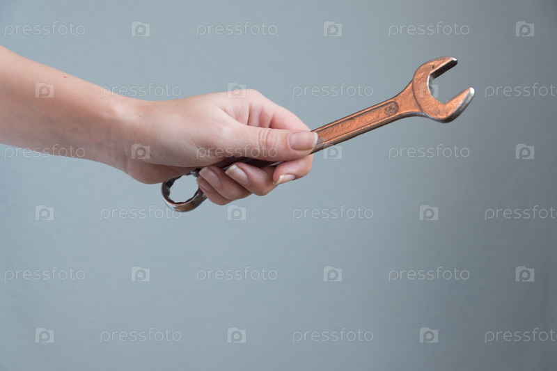 Женщина, держащая гаечный ключ в руке на сером фоне