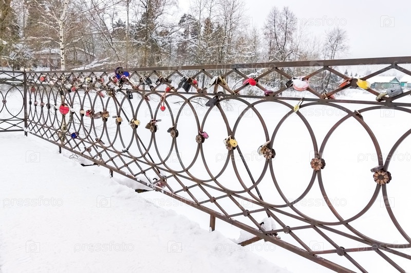 Любовные замки на мосту через реку зимой