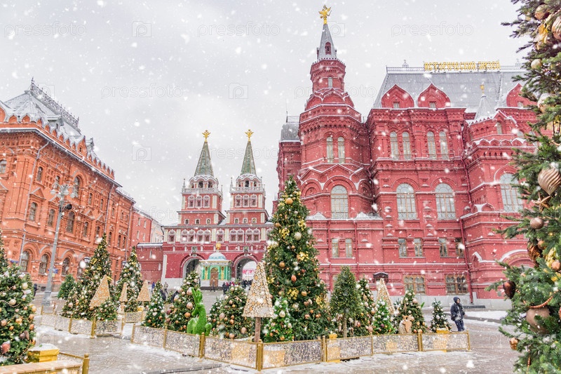 Москва, Россия - 20 декабря: Рождество украсило Манежную площадь в снежный день. Много новогодних елок на фоне Красной площади