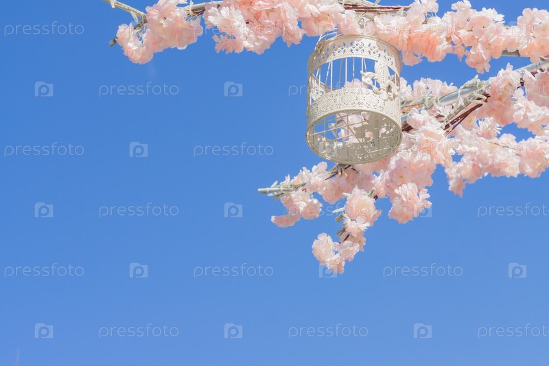Белая декоративная клетка для птиц висит на ветке цветущей яблони на фоне неба. Украшение весеннего города