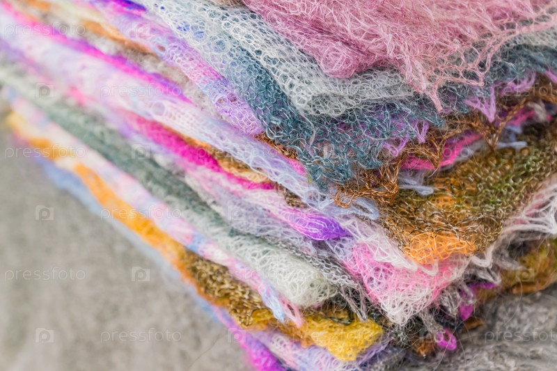 Стек вязаных пуховых шарфов. Знаменитые русские оренбургские платки. Схема вязания крючком