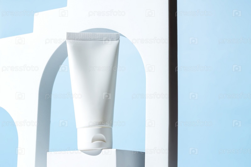 Белый небрендированный пластиковый тюбик для крема или шампуня стоит на белом подиуме в белой арке на синем фоне. Витрина косметики. Макет
