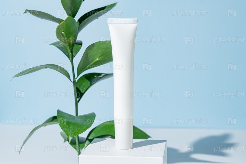 Эстетическая минималистская концепция красотной терапии. органический крем для глаз blanck package на белом постаменте на синем фоне. состав средств по уходу за телом, кожей, лицом