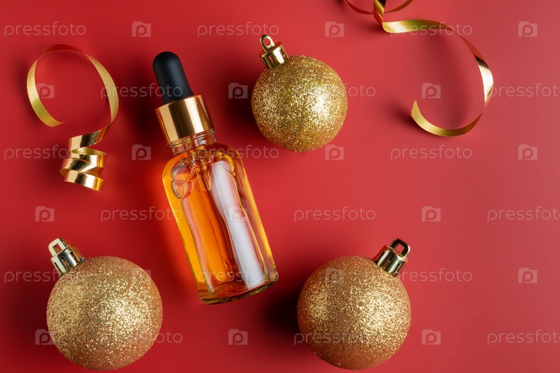 Роскошный косметический продукт, антивозрастное, увлажняющее и коллагеновое масло для лица в подарок - концепция красоты, косметики и ухода за кожей в новогоднем стиле. украшение золотыми шарами и конфетти