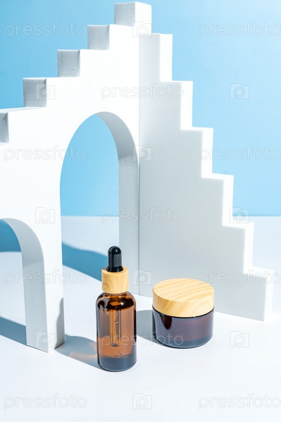 Баночка с увлажняющим кремом, сыворотка в бутылке из янтарного стекла на синем фоне. модные подиумы для презентации косметики. Набор косметических средств по уходу за кожей и телом