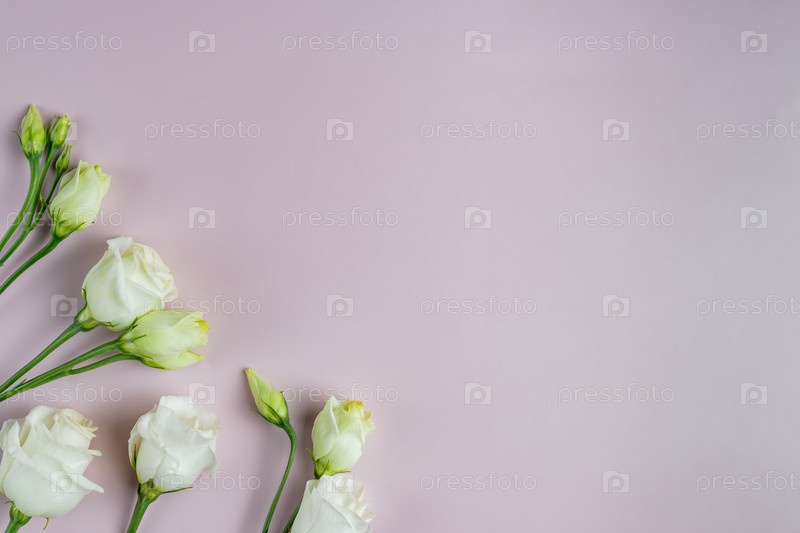 Рамка из белых цветов эустомы на розовом фоне. Плоская планировка, вид сверху. Рамка из цветов. Копировать пространство