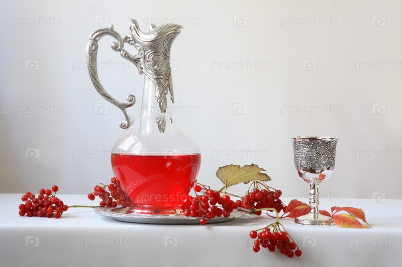 Кувшин с красным вином и ветками калины на белом фоне