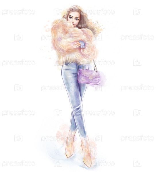 Стильная блондинка в модной одежде, с сумкой и джинсами, на изолированном белом фоне. Ручная рисованная красивая девушка. Модная женщина. Красивая леди. Акварельная иллюстрация