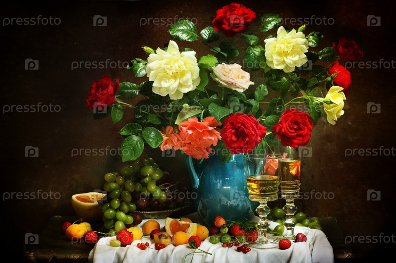 Букет роз с бокалами белого вина и фруктами