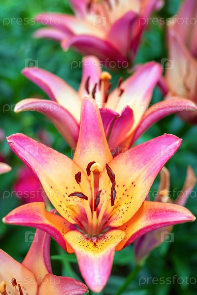 Яркий цветок лилии на фоне размытых зеленых листьев и травы. Естественный цветочный фон. Концепция флористики и украшения сада