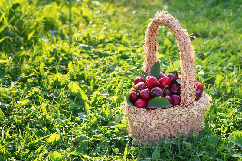 Ягоды спелых, сочных и свежих вишен в плетеной корзине на зеленой траве. Летний урожай