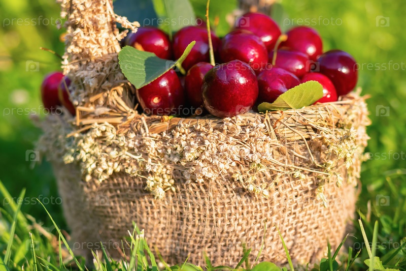 Ягоды спелых, сочных и свежих вишен в плетеной корзине на зеленой траве. Летний урожай