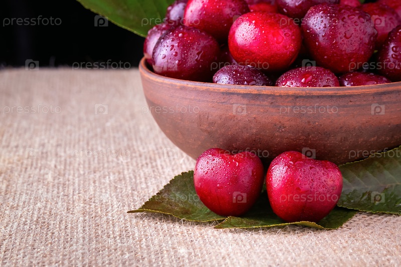 Вкусные и сочные ягоды вишни в коричневой глиняной тарелке на фоне мешковины