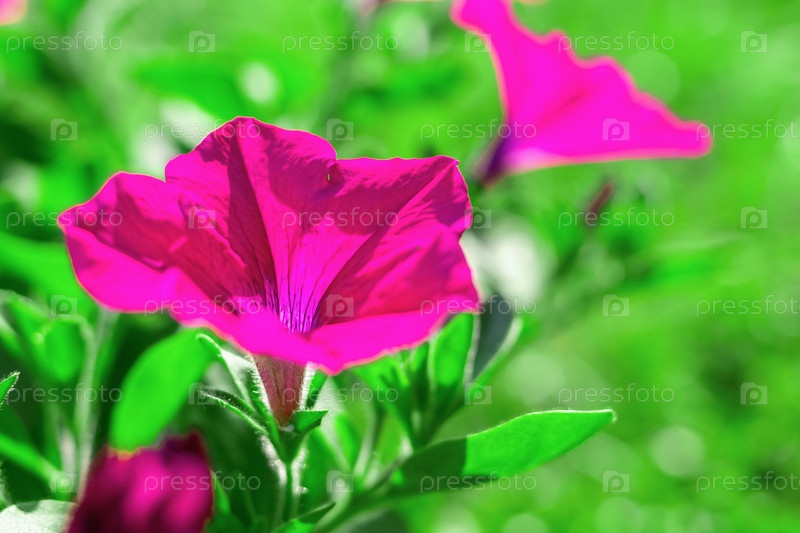 Яркий сиреневый цветок петунии на размытом фоне зеленой травы. Солнечный и летний естественный цветочный фон