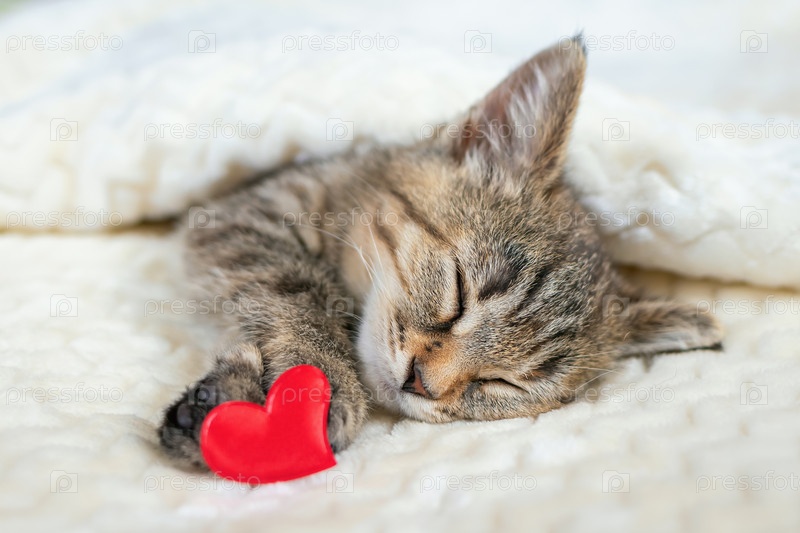Симпатичный маленький котенок спит на кровати под теплым уютным бежевым одеялом с красным сердцем. Концепция любви и заботы о домашних животных