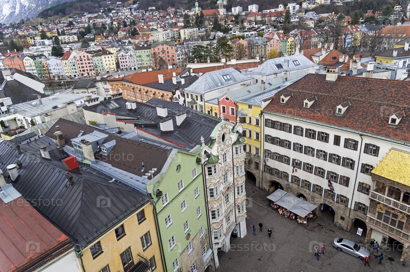 Вид с верхушки старой часовой башни на исторический центр Инсбрука. Австрия