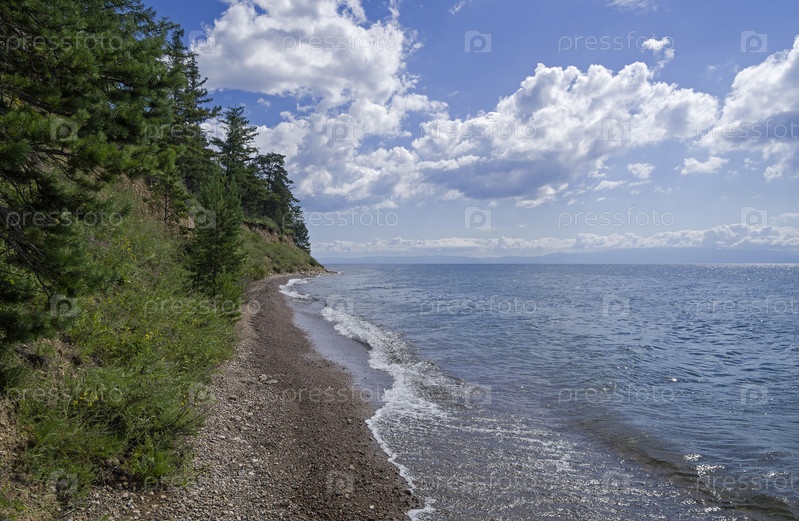 Высокий обрывистый берег озера Байкал. Иркутская область, Россия. Солнечный день в августе