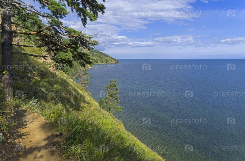 Тропа на высоком берегу озера Байкал. (Прибайкальский национальный парк - Большая Байкальская Тропа.) Солнечный день в августе