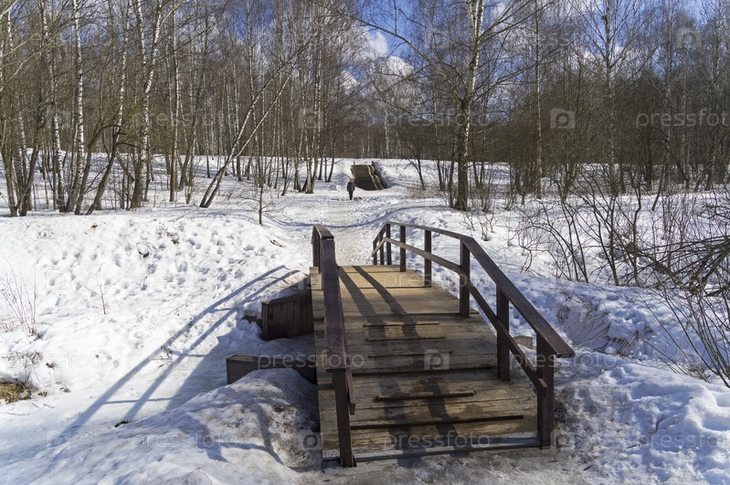 Мостик через ручей на дне небольшого оврага. Теплостановский лесопарк, Москва. Солнечный день в конце марта