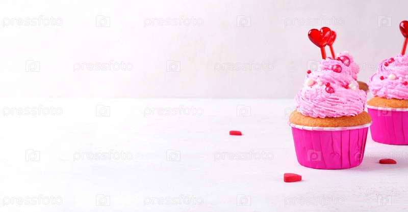 Веб-баннер с кексом с розовой глазурью, украшенный сахарной посыпкой и сердечками. Десерт размером с порцию на День святого Валентина. Макет с копией пространства