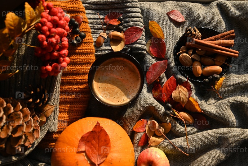 Осенний натюрморт с чашкой кофе, осенними листьями, тыквой. Вечернее время, не выходя из дома