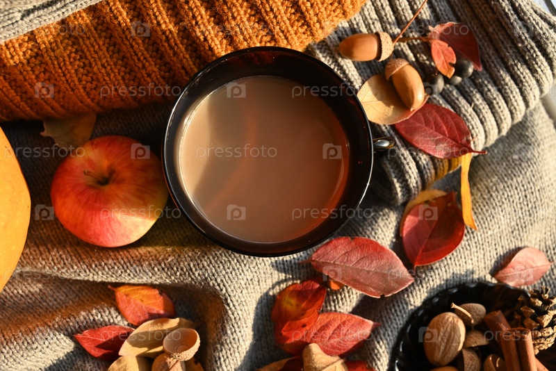 Осенний натюрморт с чашкой кофе, осенними листьями, тыквой. Вечернее время, не выходя из дома