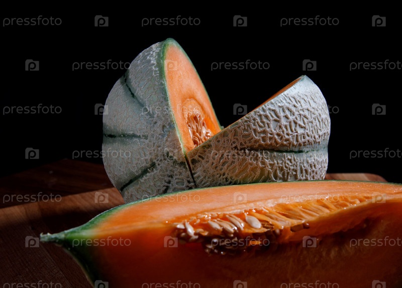Спелая вкусная дыня на деревянной доске. Красивая сочная дыня