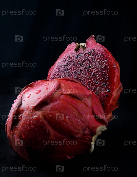 Вырежьте драконий фрукт на черном фоне. Питайя, драконий фрукт
