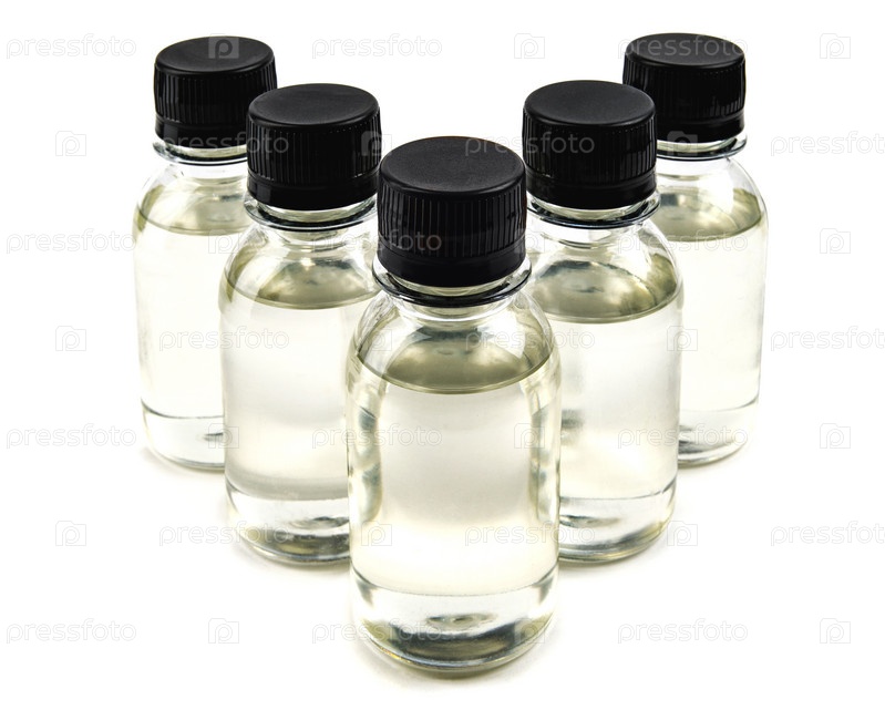 Несколько бутылок с черными крышками, наполненных прозрачной жидкостью