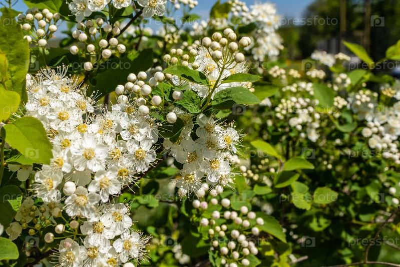Белые цветы Spiraea vanhouttei в солнечный день с каплями росы. белая смазка