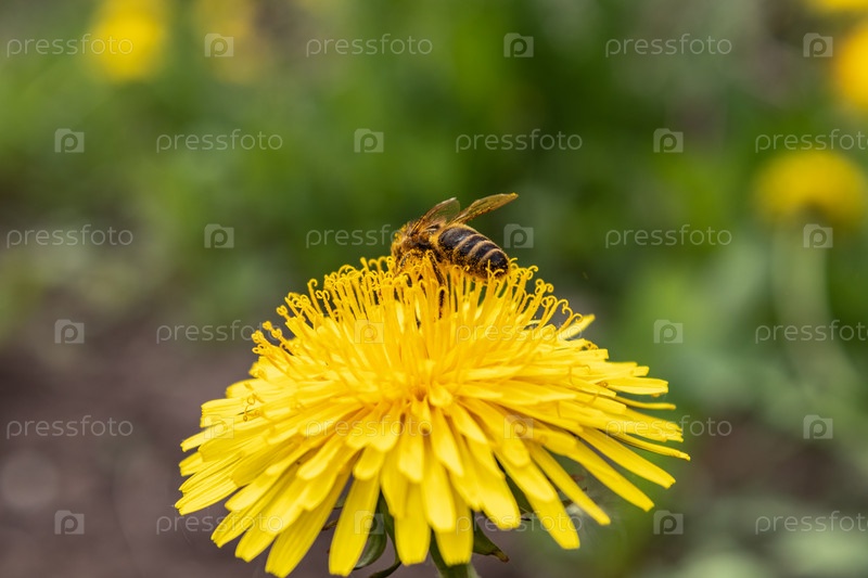 В прекрасный солнечный день медоносная пчела - Apis mellifera - собирает мед из цветов лиственницы - Taraxacum officinale