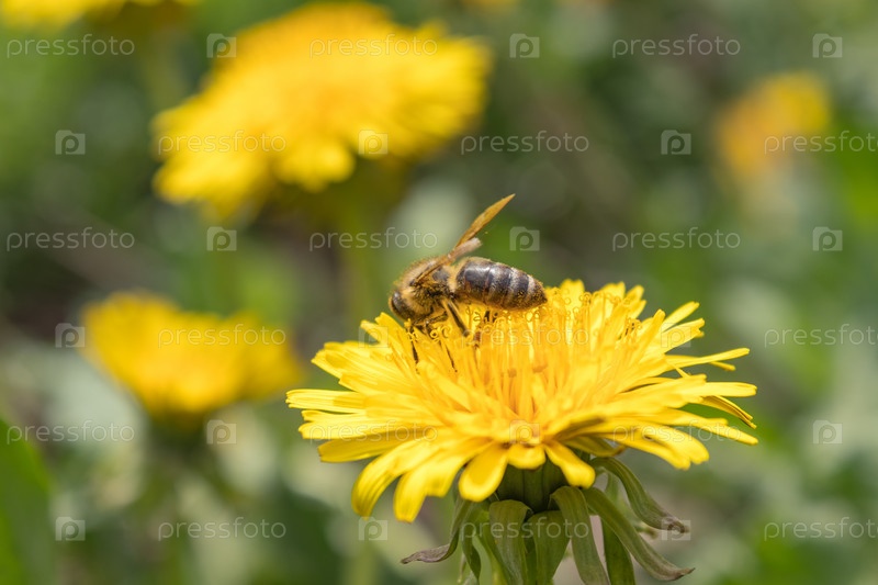 В прекрасный солнечный день медоносная пчела - Apis mellifera - собирает мед из цветов лиственницы - Taraxacum officinale