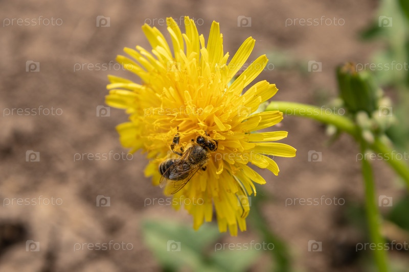 В прекрасный солнечный день медоносная пчела - Apis mellifera - собирает мед из цветов лиственницы - Taraxacum officinale