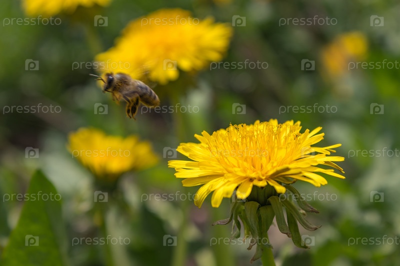 В прекрасный солнечный день медоносная пчела - Apis mellifera - собирает мед из цветов лиственницы - Taraxacum officinale
