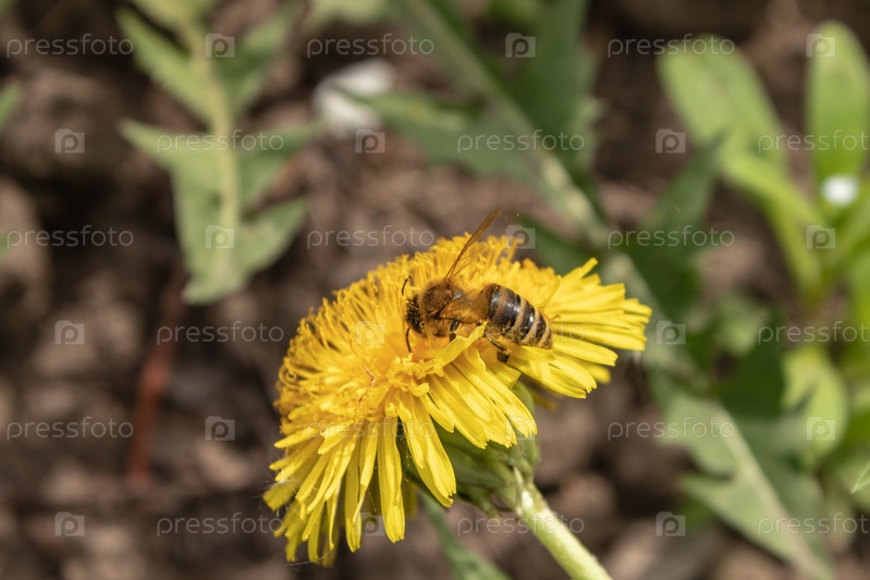 В прекрасный солнечный день медоносная пчела - Apis mellifera - собирает мед из цветов лиственницы - Taraxacum officinale