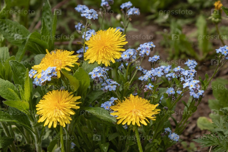 Нежные голубые незабудки и желтые одуванчики на весеннем лугу. Прекрасный весенний солнечный день