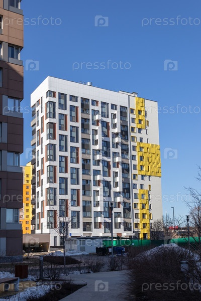 Современный многоквартирный дом с красочными фасадами на окраине города. Жилой комплекс «В лесу», Москва, Россия