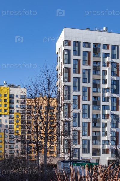 Современный многоквартирный дом с красочными фасадами на окраине города. Жилой комплекс «В лесу», Москва, Россия