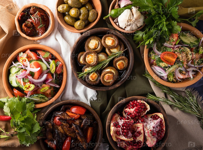 Вид сверху на столик в ресторане с изысканными грузинскими блюдами