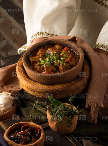 Вертикальный снимок официантки, предлагающей мясное рагу