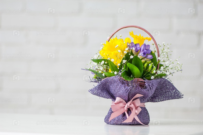 Красивая композиция с фиолетовой фрезией и нарциссами на белом фоне