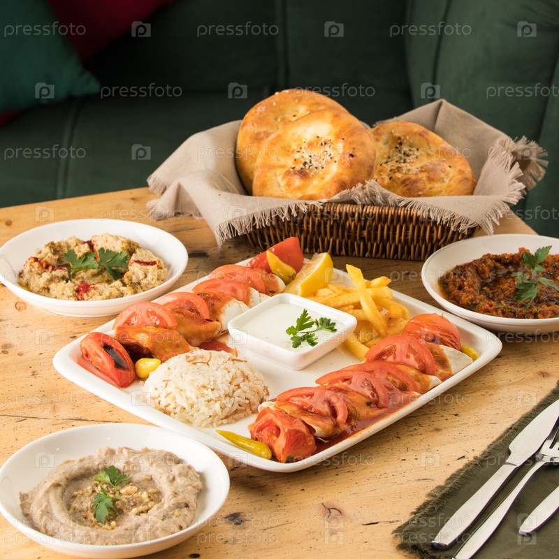 Обеденный стол, полный вкусных блюд и корзина хлеба