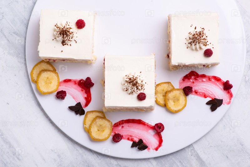 Порция вкусных кусочков фруктового ванильного торта на белой тарелке