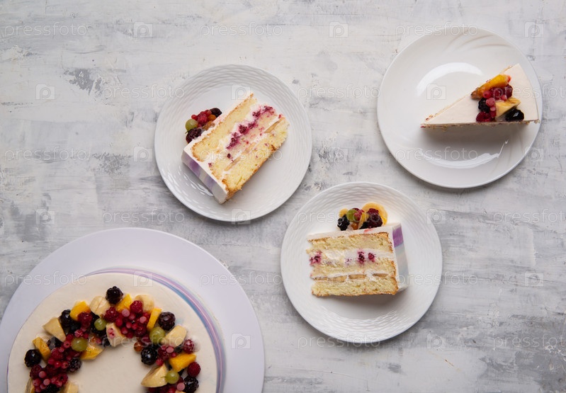 Крупный план белого слоеного торта со свежими ягодами на белых тарелках