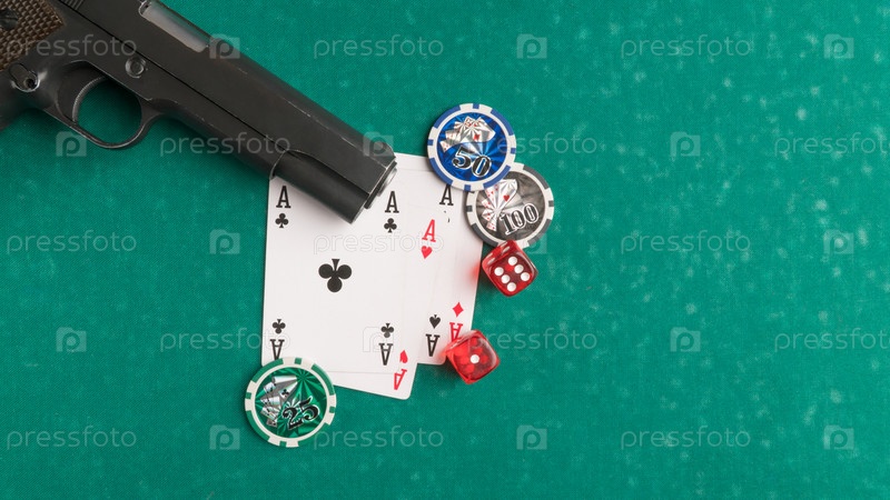 Верхний снимок оружия рядом с игральными картами и костями на доске для покера