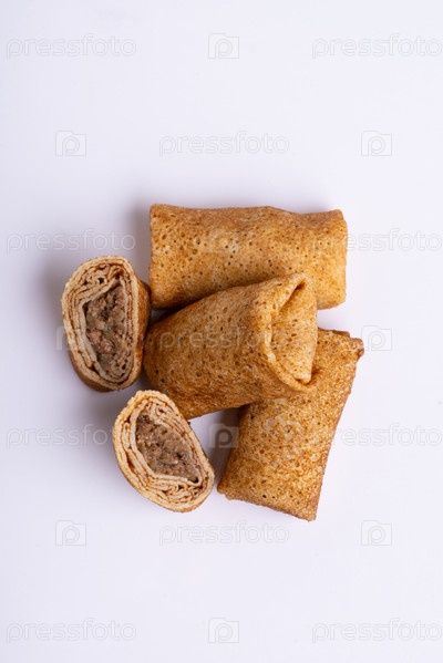 Вертикальный снимок фаршированных блинов с мясом на белом фоне