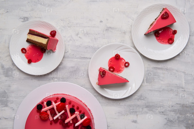 Вид сверху на ломтики вкусного торта на белых тарелках