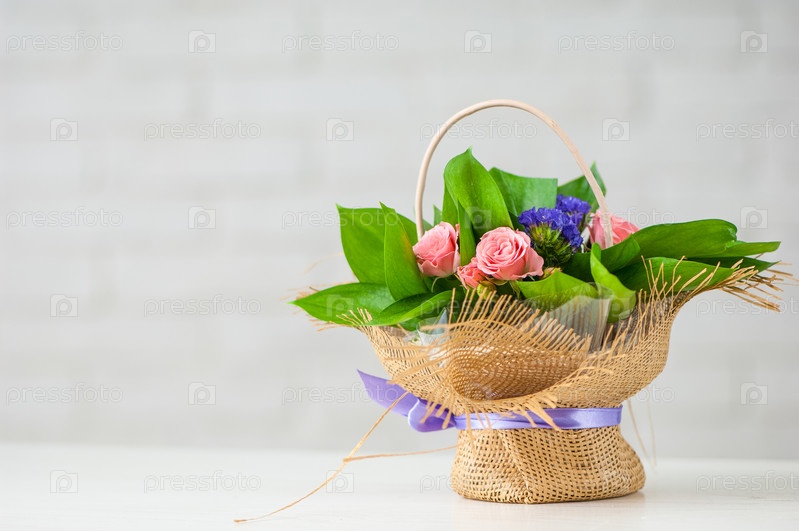 Красивый букет с розовыми розами, фиолетовым лизиантусом и зелеными листьями в корзине на столе