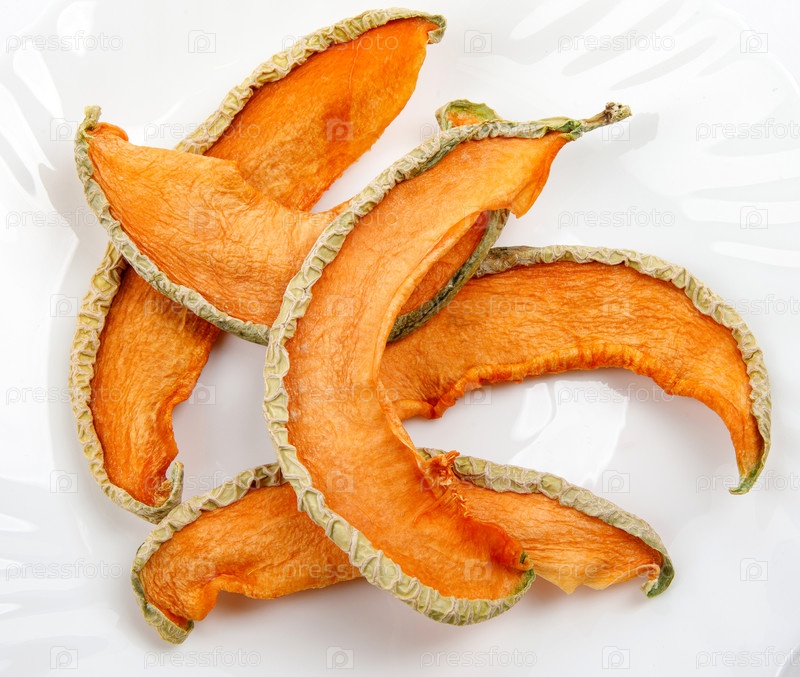 Несколько кусочков сушеной дыни на белой тарелке. сушеная дыня